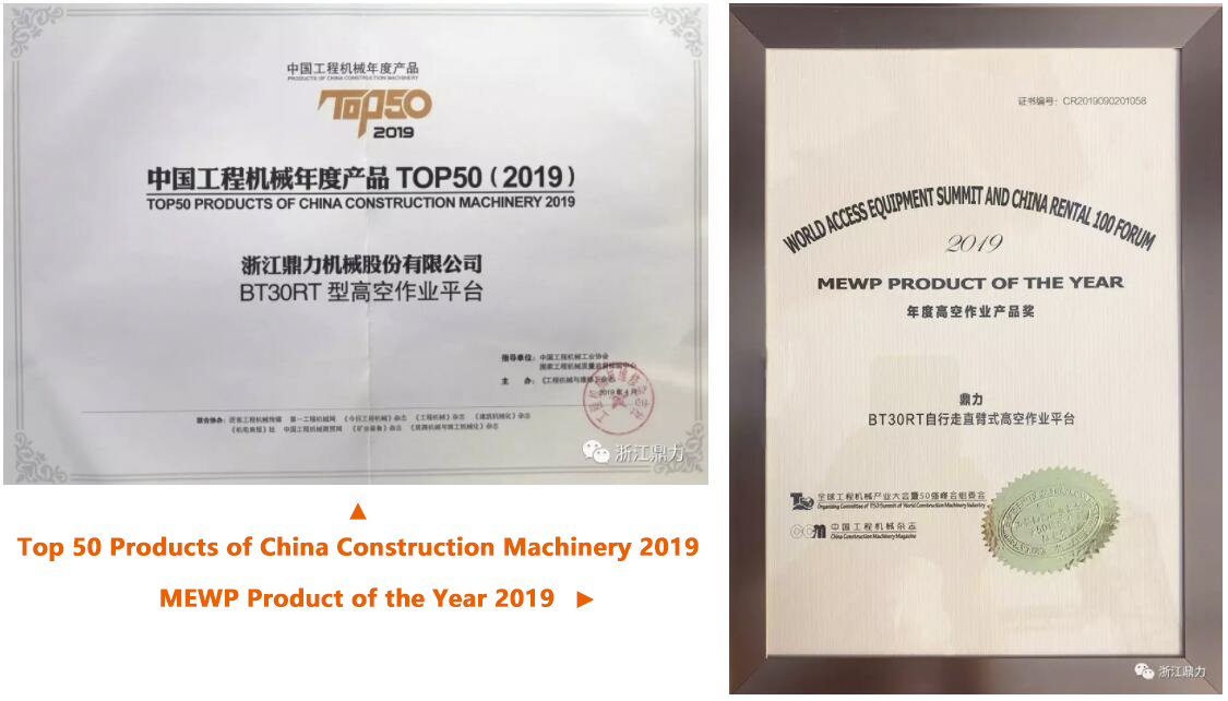 In addition to this honor, BT30RT also won the "MEWP Product of the Year 2019" issued by the global construction machinery industry conference, and was selected into the "Top 50 Products of China Construction Machinery 2019" list published by China construction machinery industry association, which shows the influence of the products in the global scope.